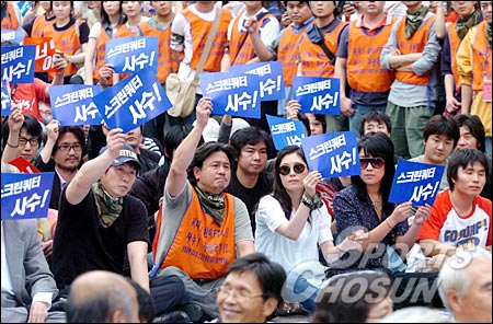 ¿µÈ¹è¿ìµéÀÌ ½ºÅ©¸°ÄõÅÍ »ç¼ö¸¦ À§ÇØ ÇÇÄÏÀ» µé°í ´ëÇзο¡¼ ±¤È¹®±îÁö °Å¸®ÇàÁøÀ» ÆîÄ¡°í ÀÖ´Ù.
