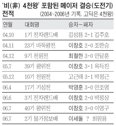 Çö ¡®4õ¿Õ¡¯ÀÇ À§¼¼´Â ´ë´ÜÇØ¼ À¢¸¸ÇÑ Å¸ÀÌÆ² µµÀü±â³ª °á½ÂÀº ÀÚ±â³×µé³¢¸® ÁÖ°í¹Þ´Â °æ¿ì°¡ ´ëºÎºÐÀÌ´Ù. ¾î¼´Ù ¡®ºñ(Þª) 4õ¿Õ¡¯ ¸â¹öµéÀÌ ¿Ã¶ó¿Íµµ À̵éÀ» À̰ܳ»Áö ¸øÇÑ´Ù. °í±ÙÅÂÀÇ Ãµ¿ø Å»Ãëµµ 4õ¿Õ ¸â¹ö¸¦ ²ª°í ¾òÀº °Ô ¾Æ´Ï¾ú´Ù. 2004³â ÀüÀÚ·£µå¹è¸¦ ÀïÃëÇß´ø ±è¼º·æ ¿ª½Ã °á½ÂÀü »ó´ë´Â 4õ¿Õ ¼Ò¼ÓÀÌ ¾Æ´Ñ ±èÁÖÈ£¿´´Ù.