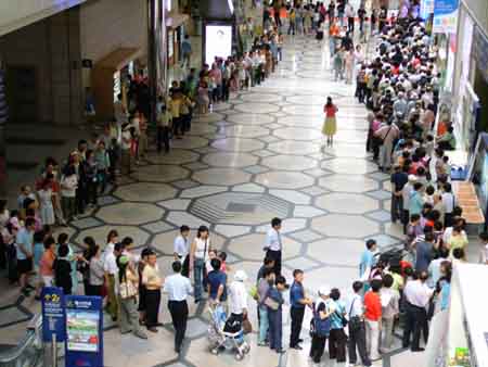 ÁõÁ¤Ç°À» ¹Þ¾Æ°¡±â À§ÇØ ´ë»ó À£¶óÀÌÇÁ ºÎ½º ¾Õ¿¡¼ ±æ°Ô ÁÙÀ» ¼°í ÀÖ´Ù.