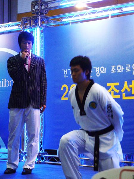 2006 Á¶¼±ÀϺ¸ °Ç°¹Ú¶÷ȸ È«º¸´ë»ç·Î ¼±Á¤µÈ ¹®´ë¼º ¼±¼ö. °Ç°¿¡ µµ¿òµÇ´Â űǵµ µ¿ÀÛÀ» ¼³¸íÇϰí ÀÖ´Ù.
