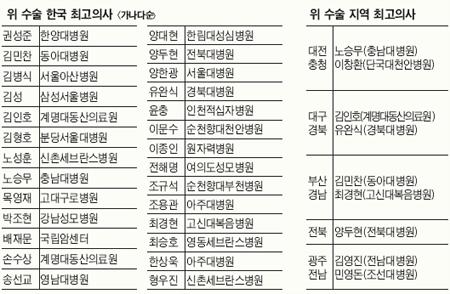 Çѱ¹ ÃÖ°í ÀÇ»ç À§ ¼ö¼ú ºÐ¾ß¿¡¼ 1¸í ÀÌ»óÀÇ ÃßõÀ» ¹Þ¾Æ ¸í´Ü¿¡ ¿À¸¥ Àü¹®ÀÇ´Â ¸ðµÎ 27¸íÀ̾ú´Ù. ÀÌ °¡¿îµ¥ °¡Àå ¸¹Àº ÃßõÀ» ¹Þ¾Æ ¡®Çѱ¹ ÃÖ°í Àǻ硯·Î ¼±Á¤µÈ 5ÀÎÀº ±Ç¼ºÁØ(ÇѾç´ëº´¿ø), ±èº´½Ä(¼¿ï¾Æ»êº´¿ø), ³ë¼ºÈÆ(½ÅÃ̼¼ºê¶õ½ºº´¿ø), ¹ÚÁ¶Çö(°³²¼º¸ðº´¿ø), ¾çÇѱ¤(¼¿ï´ëº´¿ø) µî ¸ðµÎ ¼¿ï ¼ÒÀç ´ëÇк´¿ø ±³¼öµéÀ̾ú´Ù.(°¡³ª´Ù¼ø)