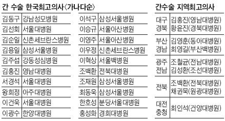 °£ ¼ö¼ú Àü¹® ±³¼ö 2¸í ÀÌ»óÀ¸·ÎºÎÅÍ ÃßõÀ» ¹Þ¾Æ °£ ¼ö¼ú ºÐ¾ß Çѱ¹ÃÖ°íÀǻ翡 ¿À¸¥ Àü¹®ÀÇ´Â ¸ðµÎ 20¸íÀ̾ú´Ù. ÀÌ °¡¿îµ¥ ±èµ¿±¸(°³²¼º¸ðº´¿ø), ¼°æ¼®(¼¿ï´ëº´¿ø), ¿ÕÈñÁ¤(¾ÆÁִ뺴¿ø), À̰ǿí(¼¿ï´ëº´¿ø), À̽±Ô(¼¿ï¾Æ»êº´¿ø), Á¶Àç¿ø(»ï¼º¼¿ïº´¿ø) ±³¼ö µî 6¸íÀÌ °¡Àå ¸¹Àº ÃßõÀ» ¹Þ¾Ò´Ù.(°¡³ª´Ù¼ø)