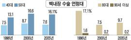 1996³â ÀüüÀÇ 13.1%¿´´ø 50´ë ¹é³»Àå ¼ö¼úȯÀÚ´Â ÇØ¸¶´Ù ²ÙÁØÈ÷ Áõ°¡ÇØ 2005³â¿¡16.1%¸¦ ±â·ÏÇß´Ù. 40´ëÀÇ °æ¿ì, 1996³â¿¡ 7.4%¿´À¸³ª 2003³â¿¡´Â 9.2%¸¦ Â÷ÁöÇß´Ù. ¹Ý¸é 80´ë ¼ö¼ú ȯÀÚ´Â 1996³â 17.1%¿¡¼ 2005³â¿¡´Â 9.7%·Î °¨¼ÒÇß´Ù. 90¼¼ ÀÌ»ó ȯÀÚµµ °¨¼Ò¼¼¸¦ º¸¿´´Ù.