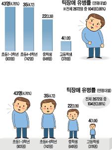 ¿ì¸®³ª¶ó ÃʵîÇлý 100¸í Áß 5¸íÀº ƽÀå¾Ö¸¦ °®°í ÀÖ´Â °ÍÀ¸·Î Á¶»çµÆ´Ù. ¼¿ï´ëº´¿ø ¼Ò¾ÆÁ¤½Å°ú Á¶¼öö ±³¼ö µîÀÌ 2005³â 9~12¿ù ¼¿ï½Ã³» 7~18¼¼ û¼Ò³â 2672¸íÀ» ´ë»óÀ¸·Î ¸éÁ¢Á¶»ç¸¦ ½Ç½ÃÇÑ °á°ú, Áß°í»ýÀ» Æ÷ÇÔÇÑ Àüü¿¡¼´Â 104¸í(3.89%), ÃʵîÇлý 1645¸í °¡¿îµ¥´Â 78¸í(4.74%)ÀÌ Æ½Àå¾Ö¸¦ °®°í ÀÖ¾ú´Ù. ƽÀå¾Ö À¯º´·ü(êóÜ»×Ë)¿¡ ´ëÇÑ ´ë±Ô¸ð Á¶»ç´Â ±¹³»¿¡¼± ÃÖÃÊÀ̸ç, ±¹Á¦ÀûÀ¸·Îµµ 6¹øÂ°¶ó°í ¿¬±¸ÁøÀº ¹àÇû´Ù.