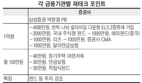 2000¸¸¿øÀº ±¹³» ÁÖ½ÄÇü ÆÝµå¿¡ °¡ÀÔÇϰí 1000¸¸¿øÀº ÇØ¿ÜÆÝµå(Áß±¹), 1000¸¸¿øÀº ºÎµ¿»ê °£Á¢ÅõÀÚ ÆÝµåÀÎ ¸®Ã÷¿¡ ÅõÀÚÇÒ °ÍÀ» ±ÇÇß´Ù. 1000¸¸¿øÀº ȯÂ÷ÀÍÀ» ¿Ã¸± ¼ö ÀÖ´Â ´Þ·¯¿¬±Ýº¸Çè(´Þ·¯·Î °¡ÀÔ ÈÄ ´Þ·¯·Î ¿¬±ÝÀ» Áö±Þ¹Þ´Â º¸Çè), ³ª¸ÓÁö 1000¸¸¿øÀº À¯µ¿¼ºÀ» È®º¸Çϱâ À§ÇØ ¼ö½ÃÀÔÃâ±ÝÀ» ÇÏ´õ¶óµµ ¿¬ 4% ¼öÁØÀÇ ÀÌÀÚ°¡ Áö±ÞµÇ´Â Áõ±Ç»ç CMA (ÀÚ»ê°ü¸®°èÁÂ)¿¡ ³Ö¾îµÐ´Ù.