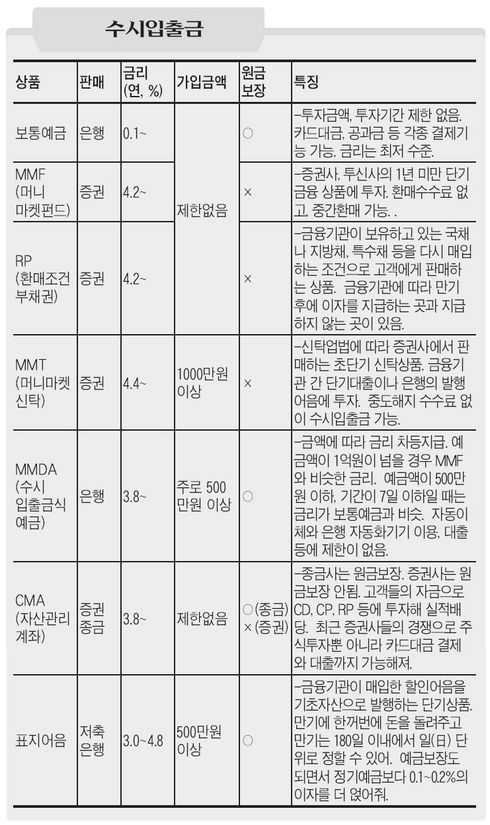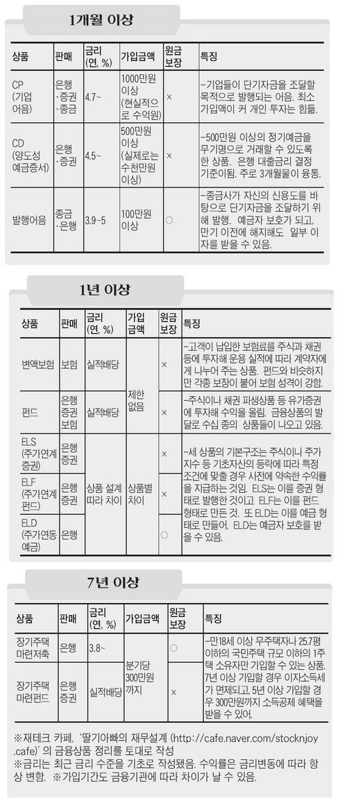 ÀçÅ×Å©ÀÇ ±âº»Àº ÅõÀÚ ¸ñÀû°ú ±â°£À» »ìÇÇ´Â °ÍÀÌ´Ù. ¾Æ¹«¸® ±Ý¸®°¡ ³ô´Ù°í ÇØµµ ¼ö½Ã ÀÔ¡¤Ãâ±Ý½Ä »óǰ¿¡ 1³â ÀÌ»ó µ·À» ¹¬Çô ³õ´Â °ÍÀº ¹Ùº¸ ÁþÀÌ´Ù. ¿¹¸¦ µé¾î MMFÀÇ ±Ý¸®°¡ ¿¬ 4%¶ó°í ÇØ¼ °Å±â¿¡ µ·À» 6°³¿ù ÀÌ»ó ¹¬Çô ³õ¾Æ¼´Â ¾È µÈ´Ù. ÀºÇàÀ̳ª ÀúÃàÀºÇàÀÇ Á¤±â¿¹±ÝÀ¸·Î °¥¾ÆÅ¸¸é 4.5%´Â ¹ÞÀ» ¼ö Àֱ⠶§¹®ÀÌ´Ù. ¿ø±Ý º¸ÀåÀÌ µÇ´ÂÁö ¿©ºÎµµ Áß¿äÇÏ´Ù. ³ôÀº ¼öÀÍ·üÀ» ¿Ã¸± ¼ö ÀÖ´Ù°í ¼±ÀüÇØ °¡ÀÔÇß´õ´Ï °©Àڱ⠿ø±Ý ¼Õ½ÇÀÌ ³ª´Â °æ¿ìµµ ¸¹±â ¶§¹®ÀÌ´Ù. ÅõÀڱⰣÀ» º¸°í ¿ø±Ý º¸Á¸ ¿©ºÎ¸¦ È®ÀÎÇÑ µÚ Àû´çÇÑ ±Ý¸®´ë¿¡ ¸ÂÃç »óǰÀ» °ñ¶óº¸ÀÚ.¡´Ç¥ÂüÁ¶¡µ