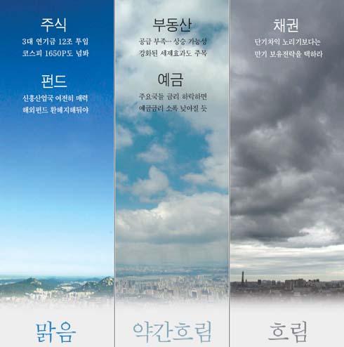 ±×µéÀÌ Àü¸ÁÇÏ´Â »õÇØ ÀçÅ×Å© ±â»óµµ(ѨßÚÓñ)´Â ¡®ÁÖ½Ä ¸¼À½, ºÎµ¿»ê¡¤¿¹±Ý ¾à°£ È帲, ä±Ç È帲¡¯À̾ú´Ù. ±¹³» Áõ½Ã¿¡ ´ëÇØ¼± 8¸íÀÌ ¸¼À» °ÍÀ¸·Î ºÃ°í, ÇØ¿Ü ÁÖ½ÄÀº 6¸íÀÌ ¸¼°Ú´Ù°í ÀÀ´äÇß´Ù. ±¹³»¡¤ÇØ¿Ü ÆÝµå´Â °¢°¢ 7¸íÀÌ ¡®¸¼À½¡¯ ÂÊ¿¡ Á¡¼ö¸¦ Áá´Ù. ºÎµ¿»ê½ÃÀåÀº ¾îµÎ¿î Àü¸ÁÀÌ ´Ù¼ö¿´´Ù. 7¸íÀÌ ¡®±¸¸§ ¾à°£ ³¥ °Í¡¯À̶ó°í Çß´Ù. ¿¹±ÝÀº 4¸í, ä±ÇÀº 5¸íÀÌ ¡®±¸¸§ ³¦¡¯À¸·Î ¿¹»óÇß´Ù. PBµéÀÇ Àü¸ÁÀ» Á¾ÇÕÇØº¸¸é Ȳ±Ý µÅÁöÇØ¶ó´Â 2007³â ÀçÅ×Å©´Â ¡®ÁÖ½Ä(ÆÝµå)¡µºÎµ¿»ê¡µ¿¹±Ý¡µÃ¤±Ç¡¯ ¼øÀ¸·Î °¡Á®°¡´Â °Ô À¯¸®ÇÏ´Ù´Â ¸»ÀÌ´Ù.