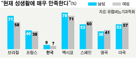 ÇÏÁö¸¸ ¡®ÇöÀç ¼º»ýȰ¿¡ ¸Å¿ì ¸¸Á·Çϴ°¡¡¯¶ó´Â Áú¹®¿¡ ¡®±×·¸´Ù¡¯°í ´äÇÑ Çѱ¹ ³²ÀÚ´Â 9%, ¿©ÀÚ´Â 7%¿¡ ºÒ°úÇß´Ù. Á¶»ç ´ë»ó±¹ °¡¿îµ¥ ÃÖÀú ¼öÁØÀÌ´Ù. ¹Ý¸é ¸ß½ÃÄÚ, ºê¶óÁú, ½ºÆäÀÎ »ç¶÷µéÀº 53¡78%°¡ ¡®¸Å¿ì ¸¸Á·ÇÑ´Ù¡¯°í ´äÇß´Ù.