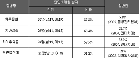 °í´ë ¾È»êº´¿ø Ä¡°ú ·ùÀçÁØ ±³¼öÆÀÀº ÃÖ±Ù 4°³¿ù °£ º´¿øÀ» ãÀº 115¸íÀÇ È¯ÀÚ (³²: 54¸í, ¿©: 61¸í)¸¦ ´ë»óÀ¸·Î ¼³¹®Á¶»ç¸¦ ÅëÇØ ¾È¸éºñ´ëĪ ȯÀÚÀÇ ±¸°Áúȯ ¹ßº´À²À» Á¶»çÇÑ °á°ú, ¾È¸éºñ´ëĪÀ» °¡Áö°í ÀÖ´Â »ç¶÷ÀÇ Ä¡ÁÖÁúȯ ¹ßº´À²(87.8%)ÀÌ ÀϹÝÀÎÀÇ Ä¡ÁÖÁúȯ À¯º´À²(9.8%)º¸´Ù 8.95¹è °¡·® ³ô¾Ò´Ù.