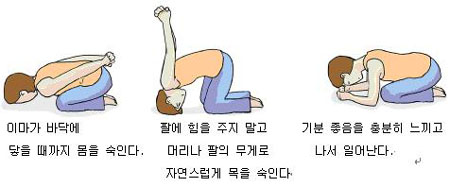 (2) õõÈ÷ ¾ûµ¢À̸¦ µé¸é¼ ¸Ó¸® ²À´ë±â¿¡ üÁßÀ» ½Ç¾î ÆÈÀ» ³ô°Ô ¿Ã¸°´Ù. ´«À» °¨°í Á¤¼ö¸® ºÎºÐÀÇ ÀÚ±ØÀ» ´À³¢¸é¼ ÀÚ¿¬½º·´°Ô È£ÈíÇϰí 10~20ÃÊ Á¤ÁöÇÑ´Ù. õõÈ÷ ÆÈÀ» ³»¸®°í È£ÈíÀ» ÅäÇÏ¸é¼ ¾ûµ¢À̸¦ ³»¸°´Ù.