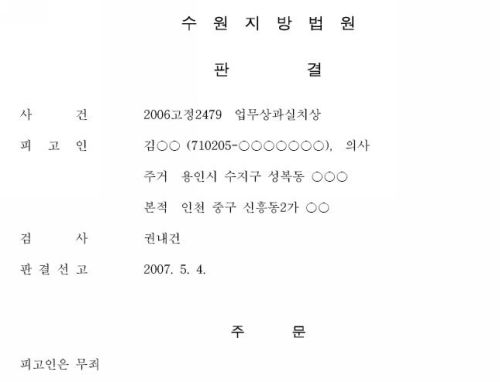 ¼ö¿øÁö¹æ¹ý¿øÀº 8ÀÏ °æ±âµµ ¿ëÀνà ¼ÒÀç 00º´¿ø ÀÀ±Þ½Ç ´çÁ÷ÀÇ»çÀÎ ±è¸ð ¾¾¿¡ ´ëÇØ "¾÷¹«»ó °ú½ÇÀÌ ÀÖ¾ú´Ù°í º¸±â ¾î·Æ´Ù"¸ç ¹«Á˸¦ ¼±°íÇß´Ù.