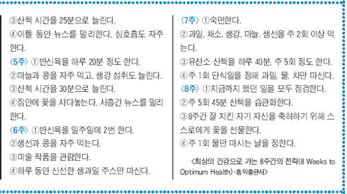 ¡°Àڽſ¡°Ô ²ÉÀ» ¼±¹°ÇÒ °Í, ÇÏ·ç 5ºÐ°£ ½ÉÈ£Èí ÇÒ °Í, ÀÏÁÖÀÏ¿¡ ÇÏ·ç´Â ¹Ì¼ú°ü °ü¶÷À», ¾Ö¿Ï µ¿¹°À» ¹Ýµå½Ã Ű¿ï °Í, Áý¾È¿¡ ÀÛÀº Á¤¿øÀ» ¸¸µé¾î ½Å¼±ÇÑ ¾ß並 Àç¹èÇØ ¸ÔÀ» °Í, ÀÏÁÖÀÏ¿¡ ÇÏ·ç´Â ´º½º¸¦ ÇÇÇÒ °Í, ºñŸ¹Î C ¼·Ãë, ÇÏ·ç¿¡ ¸¶´Ã ¼¼ ÂÊ Á¤µµ ¸ÔÀ» °Í.¡±