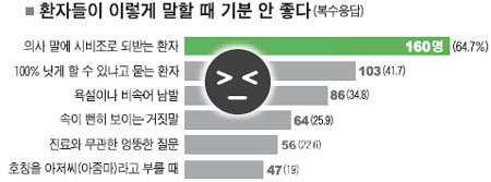 ȯÀÚµéÀÌ ¾î¶»°Ô ¸»ÇÒ ¶§ °¡Àå ±âºÐÀÌ ³ª»Û°¡¡¯¶õ Áú¹®¿¡´Â 64.7%(160¸í¡¤ÀÌÇÏ º¹¼öÀÀ´ä)°¡ ¡®ÀÇ»ç ¸»¿¡ ½ÃºñÁ¶·Î µÇ¹Þ´Â ȯÀÚ¡¯¶ó°í, 41.7%(103¸í)´Â ¡®100% ³´°Ô ÇÒ ¼ö ÀÖ´À³Ä°í ´ÙÂ¥°íÂ¥ ¹¯´Â ȯÀÚ¡¯¶ó°í ´äÇß´Ù.