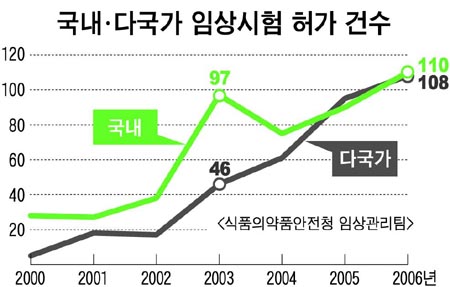 ÀÓ»ó½ÃÇèÀÌ ±ÞÁõÇϰí ÀÖ´Ù. ½Ä¾àû Áý°è¸¦ º¸¸é Áö³ 2002³â, Àüü ÀÓ»ó½ÃÇè °Ç¼ö´Â 55°Ç¿¡ ºÒ°úÇßÁö¸¸ 2003³â 143°Ç, 2005³â 185°Ç, 2006³â 218°ÇÀ¸·Î 5³â »õ 4¹è Á¤µµ ´Ã¾ú´Ù.