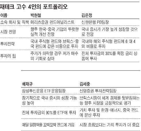 °³ÀÎÀûÀ¸·Î´Â ÁÖ½ÄÇü ÆÝµå¿Í È®Á¤ ±Ý¸® »óǰ¿¡ 7 ´ë 3ÀÇ ºñÀ²·Î ÅõÀÚÇϰí ÀÖ´Ù. ¿¬¸»¿¡ ¼Òµæ °øÁ¦¸¦ ¹ÞÀ» ¼ö ÀÖ´Â ¡®Àå±âÁÖÅø¶·ÃÀúÃ࡯°ú ¡®ÀÚÀ¯Àû¸³½ÄÀû±Ý¡¯ µîÀ» Á¦¿ÜÇÏ¸é ¸ðµÎ ÁÖ½ÄÇü ÆÝµå´Ù. ÁÖ½ÄÇü ÆÝµå¿¡´Â ±¹³»¿Í ÇØ¿Ü¸¦ 6 ´ë 4ÀÇ ºñÀ²·Î ³ª´³´Ù. ¼¼ºÎÀûÀÎ ÅõÀÚÀü·«ÀÇ °æ¿ì ±¹³» ÆÝµå´Â ¡®ÇÁ·¹½ºÆ¼Áö °í¹è´ç¡¯, ¡®¹Ì·¡¿¡¼Â3¾ï¸¸µé±â¡¯, ¡®Çѱ¹»ï¼º±×·ìÀû¸³½Ä¡¯, ¡®¹Ì·¡¿¡¼Â¸Ê½ºe-¿À¼ÇÄÚ½ºÇÇ200À妽º¡¯ µî¿¡, ÇØ¿Ü ÆÝµå´Â ¡®ºÀÁ긣Â÷À̳ª, ¡®½ÅÇѺ긯½ºÀç°£Á¢¡¯, ¡®ºÀÁ긣À¯·´¹è´ç¡¯ µî¿¡ ÀÏÁ¤ ºñÀ²¾¿ °¡ÀÔÇß´Ù. ÀÌ·± ÅõÀÚ ºñÁßÀº °è¼Ó À¯ÁöÇÒ »ý°¢ÀÌ´Ù. ¼±Áø ÁֽĽÃÀåÀº ¾ÆÁ÷ ºÒ¾ÈÁ¤ÇÏÁö¸¸ ¾Æ½Ã¾Æ Áõ½Ã´Â °ÅÀÇ È¸º¹ ´Ü°è¿¡ µé¾î¼¹´Ù°í ÆÇ´ÜÇ߱⠶§¹®ÀÌ´Ù.