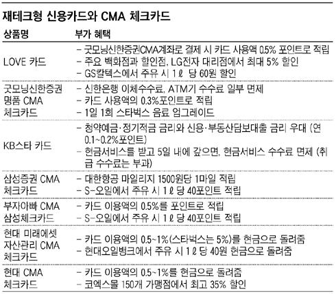ÀºÇà°è Ä«µåµéÀº »ç¿ë ½ÇÀû¿¡ µû¶ó ±ÝÀ¶ ÇýÅÃÀÌ ¸¹´Ù. ±¹¹ÎÀºÇàÀÇ ¡®KB½ºÅ¸Ä«µå¡¯¸¦ ¿¹·Î µé¸é û¾à¿¹±Ý¡¤Àû±Ý ±Ý¸®¿Í ½Å¿ë¡¤ºÎµ¿»ê´ãº¸´ëÃ⠱ݸ®µµ ¿¬ 0.1~0.2%Æ÷ÀÎÆ® ¿ì´ëÇØ ÁØ´Ù. ¾Æ¿¹ ½Å¿ëÄ«µå¸¦ ¹ö¸®°í ¿¬È¸ºñ°¡ ¾ø´Â üũīµå·Î µ¹¾Æ¼´Â °Íµµ ¡®°Ãß¡¯´Ù. ƯÈ÷ ¿¬ 4~5% »çÀÌÀÇ °í±Ý¸®¸¦ ÁÖ´Â Áõ±Ç»ç CMA(ÀÚ»ê°ü¸®°èÁÂ)¸¦ °áÁ¦ °èÁ·Π»ç¿ëÇÏ´Â ¡®CMA üũīµå¡¯°¡ À¯¸®ÇÏ´Ù.
