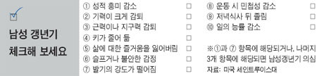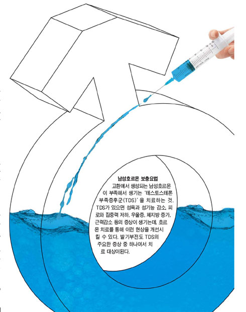 È£¸£¸ó°ú ³²¼º °»³â±â£ü¾à 40¼¼ ÀÌÈÄ¿£ ³²¼ºÈ£¸£¸ó ¼öÄ¡°¡ ¸Å³â 1.2~1.6%¾¿ ¶³¾îÁø´Ù. ³²¼ºÈ£¸£¸óÀÌ Àû¾îÁö¸é ¼º¿å ÀúÇÏ, ¹ß±â·Â °¨Åð, ¿ì¿ï°¨, üÁö¹æ Áõ°¡, ¸¸¼ºÇÇ·Î µîÀÇ Áõ»óÀÌ ³ªÅ¸³´Ù. ¿©¼º¿¡ ºø´ë¾î À̸¦ ¡®³²¼º °»³â±â Áõ»ó¡¯À̶ó°íµµ ÇÑ´Ù. ³²¼ºÈ£¸£¸ó ¼öÄ¡°¡ 10nmol/LÀÌÇÏÀÌ¸é¼ ÀÌ·± Áõ»óÀ¸·Î ºÒÆíÀ» °Þ´Â °æ¿ì, ¡®Å×½ºÅ佺Å×·Ð ºÎÁ· ÁõÈıº(TDS¡¤Testosteron Deficience Syndrome)¡¯À¸·Î Áø´ÜÇÑ´Ù. ¿ì¸®³ª¶ó 40~50´ë ³²¼º 20% Á¤µµ°¡ TDS¿¡ ÇØ´çÇÑ´Ù°í ¾Ë·ÁÁ® ÀÖ´Ù.