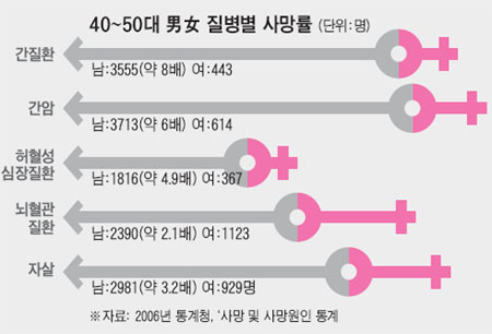 Åë°èûÀÌ ¹ßÇ¥ÇÑ ¡®2006³â »ç¸Á ¹× »ç¸Á¿øÀÎ Åë°è¡¯¿¡ µû¸£¸é 40´ë ³²¼ºÀº 40´ë ¿©¼ºº¸´Ù 2.7¹è, 50´ë ³²¼ºÀº 50´ë ¿©¼ºº¸´Ù 2.9¹è »ç¸Á·üÀÌ ³ô¾Ò´Ù. ¡®¿äÀý(èìï¹)¡¯ ¶Ç´Â ¡®±Þ»ç(ÐáÞÝ)¡¯ÇÏ´Â Á߳⠳²¼ºÀÌ ±×¸¸Å ¸¹´Ù´Â °Í. ¿©¼º°ú ºñ±³ÇÒ ¶§, 40~50´ë ³²¼º¿¡°Ô µÎµå·¯Áø ÁúȯÀº °£Áúȯ, °£¾Ï, ÇãÇ÷¼º ½ÉÀå Áúȯ, ³úÇ÷°ü Áúȯ, °íÇ÷¾Ð µîÀ̾ú´Ù.