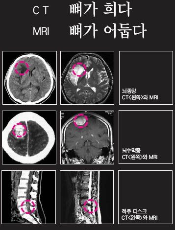 ¹æ»ç¼±Àº »À¸¦ Àß Åõ°úÇÏÁö ¸øÇϹǷΠCT »çÁø¿¡¼ »À ºÎºÐÀº Èñ°Ô º¸ÀÌÁö¸¸ MRI »çÁø¿¡¼± »À´Â ¾îµÓ°Ô, ¿¬ÇÑ Á¶Á÷Àº ¹à°Ô º¸ÀδÙ.