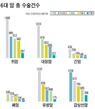 ÀÇ·á Àü¹®Áö ¡®µ¥Àϸ®¸Þµð¡¯°¡ °Ç°º¸Çè½É»çÆò°¡¿øÀÇ 2006³â 6´ë ¾Ï ¼ö¼ú °Ç¼ö¸¦ ºÐ¼®ÇÑ °á°ú ¼¿ï¾Æ»êº´¿øÀÌ 5863°ÇÀ¸·Î 1À§¸¦ Â÷ÁöÇß´Ù. ¼¿ï´ëº´¿ø°ú ¼¼ºê¶õ½ºº´¿øÀÌ °¢°¢ 3562°ÇÀ¸·Î °øµ¿ 2À§¿´À¸¸ç, »ï¼º¼¿ïº´¿ø 3577°Ç, °³²¼º¸ðº´¿ø 1151°ÇÀ̾ú´Ù. À§¾Ï, ´ëÀå¾Ï, °£¾Ï, À¯¹æ¾Ï µî 4°³ ¾Ï ¼ö¼ú °Ç¼ö´Â ¼¿ï¾Æ»êº´¿øÀÌ 1À§¿´À¸¸ç, Æó¾ÏÀº »ï¼º¼¿ïº´¿ø, °©»ó¼±¾ÏÀº ¼¼ºê¶õ½ºº´¿øÀÌ 1À§¿´´Ù.