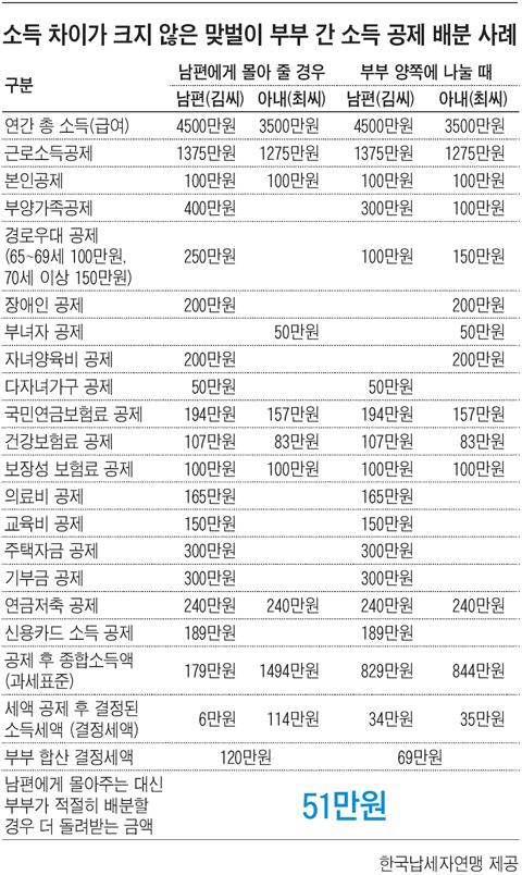 ÀÌó·³ ¿¬ºÀ Â÷À̰¡ Ŭ ¶§´Â ¼Òµæ °øÁ¦¸¦ ³²Æí¿¡°Ô ¸ô¾ÆÁÖ´Â °ÍÀÌ À¯¸®ÇÏ´Ù. ±Ù·Î¼Òµæ±Ý¾×ÀÌ 26%ÀÇ ¼Òµæ¼¼À²(4000¸¸¿ø ÀÌ»ó) Àû¿ë ±¸°£¿¡ ÀÖ´Â ³²ÆíÀÌ 17%ÀÇ ¼Òµæ¼¼À²(1000¸¸¿ø ÀÌ»ó) Àû¿ë ±¸°£¿¡ ¼ÓÇÑ ¾Æ³»¿¡ ºñÇØ ÈξÀ ¸¹Àº ¼Òµæ¼¼¸¦ ³ÂÀ» °ÍÀ̹ǷΠ±×¸¸Å ¼Òµæ°øÁ¦·Î µ¹·Á¹ÞÀ» ¼ö ÀÖ´Â µ·µµ Å©´Ù°í º¸¸é µÈ´Ù.