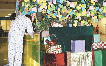 Áö³ ´Þ 19ÀÏ, ¼¿ï¾Æ»êº´¿ø µ¿°ü ·Îºñ¿¡ ´ëÇü Å©¸®½º¸¶½º Æ®¸®°¡ ¼³Ä¡µÆ´Ù. ¸î ÀÏÀÌ Áö³ªÀÚ ¿±¼¿Í ÂÊÁöµéÀÌ ¿©±âÀú±â¿¡ ³ª ºÙ¾ú´Ù. ¡®ÇҾƹöÁö »¡¸® ³ª¾Æ¼ Àú¶û °°ÀÌ ³î¾Æ¿ä¡¯ ¡®25³â ¸¸¿¡ ¿¬¼(Õüßö)¸¦ ½á º¸³»¿ä. ¿©º¸ »ç¶ûÇÕ´Ï´Ù. »¡¸® ¿ÏÄèÇϼ¼¿ä¡¯ ¡¦. ÀÔ¿ø ȯÀÚÀÇ ÄèÀ¯¸¦ ºñ´Â °£ÀýÇÑ ¼Ò¸ÁµéÀÌ´Ù. º´¿ø¿¡¼± ÀÌ Æ®¸®¸¦ ¡®Èñ¸Á³ª¹«¡¯¶ó À̸§ Áþ°í, »ç¿¬À» ÀûÀ» ¼ö ÀÖ´Â Ä«µå¿Í Çʱ⵵±¸¸¦ ºñÄ¡Çß´Ù. ¿äÁòÀº ÇÏ·ç 500~1000°³ÀÇ ¼Ò¸ÁÀÌ ³ª¹µ°¡Áö¿¡ ³»°É¸°´Ù.