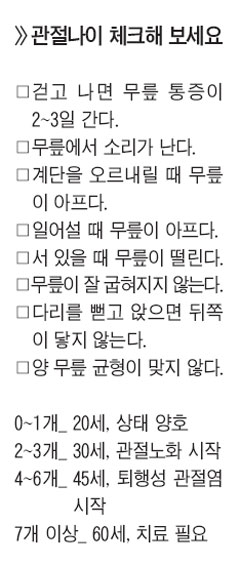 ÀÌ¿¡ ´ëÇØ °í·Á´ë¾È¾Ïº´¿ø Á¤Çü¿Ü°ú Á¤¿õ ±³¼ö´Â ¡°°¡º¿î ¿îµ¿À» ÇÏ¸é °üÀýÀ» ÁöÅÊÇÏ´Â ±ÙÀ°°ú ÀÎ´ë µîÀÌ ¹ß´ÞÇÒ »Ó ¾Æ´Ï¶ó °üÀý°ú ¿¬°ñ »ý¼º¹°ÁúÀÌ ºÐºñµÅ °üÀý°ú ¿¬°ñ ÀÚü°¡ Æ°Æ°ÇØ Áö±â ¶§¹®¡±À̶ó¸ç ¡°°í·ÉÈ ½Ã´ë¿£ °üÀýµµ ¾Æ²¸ ½á¾ß ÇϹǷΠ40´ë ÀÌÈÄ¿£ °¡±ÞÀû ¶Ù´Â °Íº¸´Ù °È´Â °ÍÀÌ ÁÁ´Ù¡±°í ¸»Çß´Ù.