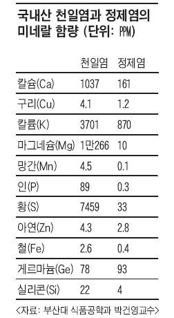 Á¤Á¦¿°(½Ä¿°)Àº °íÇ÷¾ÐÀ» ÀÏÀ¸Å°Áö¸¸ õÀÏ¿°À» °í¿Â¿¡¼ ±¸¿î ¼Ò±ÝÀº Ç÷¾ÐÀ» »ó½Â½ÃŰÁö ¾Ê´Â´Ù¡±°í ÁÖÀåÇÑ´Ù. ½ÇÁ¦·Î § ¸ÀÀ» ³»´Â ¿°È³ªÆ®·ý(NaCl) ºñÀ²Àº Á¤Á¦¿°Àº 99.8%Áö¸¸, õÀÏ¿°Àº 94.4%¿¡ ºÒ°úÇϸç, ³ª¸ÓÁö´Â ¹Ì³×¶öÀÌ´Ù. ºÎ»ê´ë ½Äǰ°øÇаú ¹Ú°Ç¿µ ±³¼ö ¿¬±¸¿¡ µû¸£¸é Á¤Á¦¿°ÀÇ Ä®½·(Ca) ÇÔ·®Àº 161PPMÀÌÁö¸¸ õÀÏ¿°Àº 1037PPMÀ¸·Î 6.4¹è´Ù. ¸¶±×³×½·(Mg)Àº Á¤Á¦¿°ÀÌ 10PPMÀε¥ ºñÇØ õÀÏ¿°Àº 1¸¸266PPMÀ¸·Î 1026¹è, Ä®·ý(K)Àº 4.25¹è, Ȳ(S)Àº 226¹è´Ù.