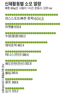 ¿îµ¿ È¿°ú´Â 'º¸Åë ÀÌ»ó'ÀÌ´Ù. ´Ü±¹´ëº´¿ø »êºÎÀΰú Áø°Ç ±³¼öÀÇ Á¶»ç¿¡ µû¸£¸é ´í½º½ºÆ÷Ã÷ Á¾¸ñÀÎ ¿ÐÃ÷, Äü ½ºÅÜ, »ï¹Ù, ÀÚÀÌºê µî ºü¸¥ ÃãÀ» Ãâ ¶§ ½Ã°£ ´ç 605§»ÀÇ ¿·®À» ¼Ò¸ðÇÑ´Ù. À̴ üÁß 60§¸ÀÎ »ç¶÷ÀÌ 1½Ã°£ µ¿¾È °¡¸¸È÷ ¾É¾Æ ÀÖÀ» ¶§ »ç¿ëµÇ´Â ¿·®(76§»)ÀÇ 8¹è ¼öÁØÀ̸ç, ¼ºÀÎ ¿©¼ºÀÇ ÇÏ·ç ¼·Ãë ¿·®(2000§»)ÀÇ ¾à 3ºÐÀÇ 1¿¡ ÇØ´çÇÑ´Ù. ÀϹÝÀûÀ¸·Î ´ÙÀÌ¾îÆ® È¿°ú°¡ ³ô´Ù°í ¾Ë·ÁÁ® ÀÖ´Â ±ÇÅõ, ¿¡¾î·Îºò, Á¶±ë µî°ú ºñ±³Çصµ ÃãÀÇ ´ÙÀÌ¾îÆ® È¿°ú°¡ ´õ Å©´Ù. ÀÏ»ê¹éº´¿ø ½ºÆ÷Ã÷ÀÇÇÐ ¼¾ÅÍ ¾çÀ±ÁØ ±³¼ö¿¡ µû¸£¸é üÁß 60§¸ÀÎ »ç¶÷ÀÌ 1½Ã°£ µ¿¾È ±ÇÅõ ¿¬½ÀÀ» Çϸé 496.8§», ¿¡¾î·ÎºòÀ» Çϸé 482.4§», ½Ã¼Ó 7~8§°·Î Á¶±ëÀ» Çϸé 489.6§»°¡ ¼Ò¸ðµÅ Ã㺸´Ù 100§» ÀÌ»ó Àû´Ù.