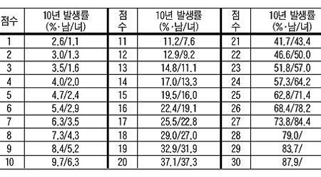<Ç¥2>Á¡¼öº° 10³â ³» ³úÁ¹Áß ¹ß»ý·ü