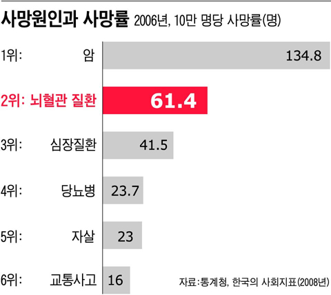 ÈçÈ÷ ÁßdzÀ̶ó ºÎ¸£´Â ³úÁ¹ÁßÀº ³úÇ÷°üÀÌ ¸·È÷°Å³ª(³ú°æ»ö) ÅÍÁ®¼(³úÃâÇ÷) »ý±â´Â Áúȯ. Åë°èûÀÇ 2006³â »ç¸Á·ü Åë°è¿¡ µû¸£¸é Àα¸ 10¸¸ ¸í ´ç 61¸íÀÌ ³úÇ÷°ü ÁúȯÀ¸·Î »ç¸ÁÇÑ´Ù. 10¸¸ ¸í ´ç 134¸íÀÎ ¾Ï¿¡ ÀÌ¾î »ç¸Á·ü 2À§Áö¸¸ µÎ Áúȯ¿¡ ´ëÇÑ »ç¶÷µéÀÇ Àνİú ŵµ Â÷ÀÌ´Â ±Ø¸íÇÏ´Ù. ¾ÏÀÇ Á¶±â ¹ß°ßÀ» À§ÇØ ¸Å³â ³»½Ã°æÀ̳ª ÃÊÀ½ÆÄ °Ë»ç¸¦ ¹Þ´Â »ç¶÷µéµµ »ç¸Á·ü 2À§ÀÎ ³úÁ¹ÁßÀº ¿î¸íÀ¸·Î »ý°¢ÇÏ´Â °æÇâÀÌ °ÇÏ´Ù. ½ÉÁö¾î ³úÁ¹ÁßÀÇ Á¶±â°ËÁø ¹æ¹ýÀÌ ÀÖ´Ù´Â »ç½ÇÁ¶Â÷ ¸ð¸£°í ÀÖ´Ù. ÀÏ¹Ý °Ç°°ËÁøÀº ¹°·ÐÀ̰í, 100¸¸¿øÀ» È£°¡ÇÏ´Â À̸¥¹Ù 'VIP°ËÁø'¿¡µµ ³úÁ¹ÁßÀ» Á¶±â ¹ß°ßÇÒ ¼ö ÀÖ´Â '°æµ¿¸Æ(ÌòÔÑØæ) ÃÊÀ½ÆÄ °Ë»ç'´Â ºüÁ®ÀÖ´Ù. ¼¿ï´ëº´¿ø ¿µ»óÀÇÇаú ÀÌÀ翵 ±³¼ö´Â "À§ ³»½Ã°æ °Ë»çÀÇ Àý¹Ý¸¸ÀÌ¶óµµ °æµ¿¸Æ °Ë»ç°¡ ½ÃÇàµÈ´Ù¸é ´ëÇѹα¹ ³úÁ¹Áß ¹ßº´·üÀÌ Áö±Ýº¸´Ù´Â È®¿¬È÷ ÁÙ¾îµé °Í"À̶ó°í ¸»ÇÑ´Ù.