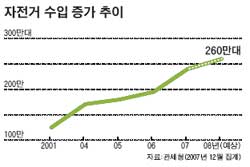 °Ç°À» À§ÇØ ÀÚÀü°Å¸¦ Ÿ´Â Àα¸°¡ ±ÞÁõÇϰí ÀÖ´Ù. °ü¼¼Ã»ÀÌ Áý°èÇÑ ¿¬µµº° ÀÚÀü°Å ¼öÀÔ·®Àº 2001³â 125¸¸´ë, 2004³â 171¸¸´ë, 2005³â 180¸¸´ë, 2006³â 195¸¸´ë, 2007³â 240¸¸´ë·Î 6³â »çÀÌ 2¹è ÀÌ»ó ´Ã¾ú´Ù. Á¤ºÎ¿¡¼± ¿ÃÇØ¿¡¸¸ 260¸¸´ëÀÇ ÀÚÀü°Å°¡ ´õ ¼öÀÔ¡¤ÆÇ¸ÅµÉ °ÍÀ¸·Î ³»´ÙºÃ´Ù.
