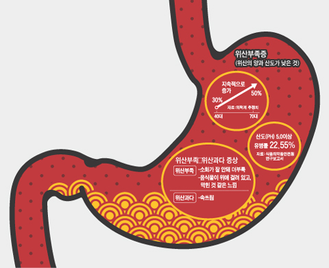 ½ÄǰÀǾàǰ¾ÈÀüû ¿¬±¸ º¸°í¼¿¡ µû¸£¸é À§»êºÎÁ·ÀÇ ±âÁØÀÎ »êµµ(PH) 5.0 ÀÌ»ó ȯÀÚ°¡ ÀüüÀÇ 22.55%¿´´Ù. ¿¬±¸¸¦ ÁøÇàÇÑ ÇѾç´ë ÀÇ´ë ¾à¸®Çб³½Ç °ÁÖ¼· ±³¼ö´Â "³ªÀ̰¡ ¸¹À»¼ö·Ï À§»êÀÌ ºÎÁ·ÇÑ »ç¶÷ÀÌ ¸¹¾ÆÁö´Â °æÇâÀ» º¸¿´´Ù"°í ¸»Çß´Ù. ºÐ´ç¼¿ï´ëº´¿ø ¼Òȱ⳻°ú ±è³ª¿µ ±³¼ö´Â "Á¤È®ÇÑ Åë°è´Â ¾øÁö¸¸ À§»êºÎÁ·À» È£¼ÒÇÏ´Â »ç¶÷Àº 40´ë ¶§ ¾à 30%¿¡¼ 70´ë ¶§ ¾à 50%±îÁö Áõ°¡ÇÏ´Â °ÍÀ¸·Î ÃßÁ¤µÈ´Ù"°í ¸»Çß´Ù.