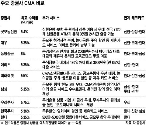 ºÎ°¡¼ºñ½ºµµ ì°Ü¶óÁõ±Ç»ç¸¶´Ù CMA ±Ý¸®°¡ ´Ù¸¥ ¸¸Å ºÎ°¡¼ºñ½ºµµ ´Ù¾çÇÏ´Ù. ±âÁ¸ CMA´Â ±Þ¿©ÀÌü¡¤¼¼±Ý³³ºÎ µîÀÇ ¿ëµµ¿¡ ±×ÃÆÁö¸¸ ÃÖ±Ù¿¡´Â ÀºÇࡤº¸Çè µî°ú ¿¬°èµÅ ´ëÃ⼺ñ½º±îÁö °¡´ÉÇØÁ³´Ù.