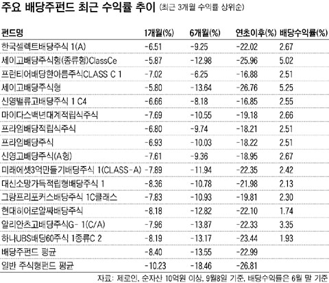 Ǫ¸£µ§¼ÈÀÚ»ê¿î¿ëÀÇ 'Ǫ¸£µ§¼È¹è´çÆ÷Ä¿½ºÁÖ½Ä 1(B)'ÀÌ -28.13%¸¦ ±â·ÏÇØ ¼ºÀû Â÷À̰¡ ¾à 18%Æ÷ÀÎÆ®¸¦ ³Ñ´Â´Ù. ¹è´ç¼öÀÍ·üÀº ÈÄÀÚ°¡ ÀüÀÚº¸´Ù ¿¬ 0.8% Á¤µµ ³ôÁö¸¸ À̸¦ °¨¾ÈÇÏ´õ¶óµµ ÇÁ·±Æ¼¾î¹è´çÇѾƸ§ÁÖ½Ä ÆÝµå°¡ ¿¬ 17%Æ÷ÀÎÆ® ÀÌ»ó ¼öÀÍ·üÀÌ ³ô´Ù. ÀÌ ¶§¹®¿¡ ¹è´çÁÖ ÆÝµå¸¦ °í¸¦ ¶§µµ ¹è´ç¼öÀÍ·üº¸´Ù´Â ¾î¶² ÁֽĿ¡ ÅõÀÚÇÏ´ÂÁö, ÅõÀÚ¼ºÇâÀ» µûÁ®º¸´Â °ÍÀÌ Áß¿äÇÏ´Ù.