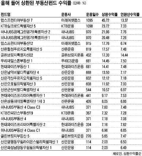 Àü±¹ °¢Áö¿¡¼ ¹ÌºÐ¾ç ¾ÆÆÄÆ®°¡ Áõ°¡Çϰí, Áý°ªÀÌ Ç϶ôÇϰí ÀÖÀ½¿¡µµ ºÒ±¸Çϰí, ư½ÇÇÑ ¼ºÀûÀ» º¸À̰í ÀÖ´Â ºÎµ¿»ê ÆÝµå¿¡ °ü½ÉÀÌ ½ò¸®°í ÀÖ´Ù. 'ºÒÆÐ½ÅÈ'¸¦ ÀÚ¶ûÇÏ´ø °³²¾ÆÆÄÆ® °¡°Ý¸¶Àú ¿Ã µé¾î ÀϺο¡¼´Â ÃÖ°í 30% °¡·® ¶³¾îÁø °÷µµ ³ª¿À°í ÀÖÁö¸¸, ÀÌ·± »óȲ¿¡¼µµ ÃÖ±Ù ¸¸±â¸¦ ¸ÂÀº ºÎµ¿»ê ÆÝµå´Â ¿¬ 6~14%ÀÇ ¼öÀÍÀ» °ÅµÐ °ÍÀ¸·Î ³ªÅ¸³µ´Ù. ÃÖ±Ù Áõ½Ã°¡ ¹«³ÊÁö¸é¼ ÁÖ½ÄÇü ÆÝµå ¼öÀÍ·üÀÌ ±Þ¶ôÇϰí ÀÖ¾î ÀÌµé ÆÝµåÀÇ ¼±ÀüÀÌ ´«¿¡ ¶è´Ù.