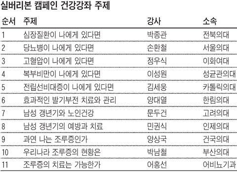 'Áß³â ÀÌÈÄÀÇ ³²¼º »îÀÇ Áú, ¾î¶»°Ô °ü¸®ÇÒ °ÍÀΰ¡'¸¦ ÁÖÁ¦·Î ÁøÇàµÇ´Â À̹ø °Ç°°Á¿¡¼´Â ¡ãÈ¿°úÀûÀÎ ¹ß±âºÎÀü Ä¡·á¿Í °ü¸® ¡ã°íÇ÷¾Ð¡¤´ç´¢º´¡¤½ÉÀåÁúȯ¡¤º¹ºÎºñ¸¸¡¤Àü¸³¼±ºñ´ëÁõÀÌ ³ª¿¡°Ô ÀÖ´Ù¸é ¡ãÁ¶·çÁõ ÇöȲ°ú Ä¡·á µî¿¡ ´ëÇØ °¢ ºÐ¾ß Àü¹®Àǰ¡ Á÷Á¢ °ÀÇÇÑ´Ù. ¾ÈÅ¿µ(¿ï»êÀÇ´ë ºñ´¢±â°ú), ±èÁ¦Á¾(°í·ÁÀÇ´ë ºñ´¢±â°ú), ¼ÁرÔ(ÀÎÇÏÀÇ´ë ºñ´¢±â°ú) ±³¼ö´Â Á߳⠳²¼ºÀÇ °Ç°¿¡ ´ëÇÑ Æ¯º°°¿¬À» ÇÑ´Ù. °ü½É ÀÖ´Â »ç¶÷Àº ´©±¸³ª Âü°¡ÇÒ ¼ö ÀÖÀ¸¸ç, Âü°¡ºñ´Â ¾ø´Ù.