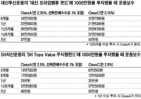 ¹Ý´ë·Î 6°³¿ù µ¿¾È 1000¸¸¿øÀ» ÅõÀÚÇß´Ù°í Çϸé AÇüÀº 15¸¸4850¿ø(¼±Ãë¼ö¼ö·á 1%£«6°³¿ù ¿î¿ëº¸¼ö 0.5485%)À», CÇüÀº 10¸¸4850¿ø(6°³¿ù ¿î¿ëº¸¼ö 1.0485%)À» ³»¾ß ÇÑ´Ù.