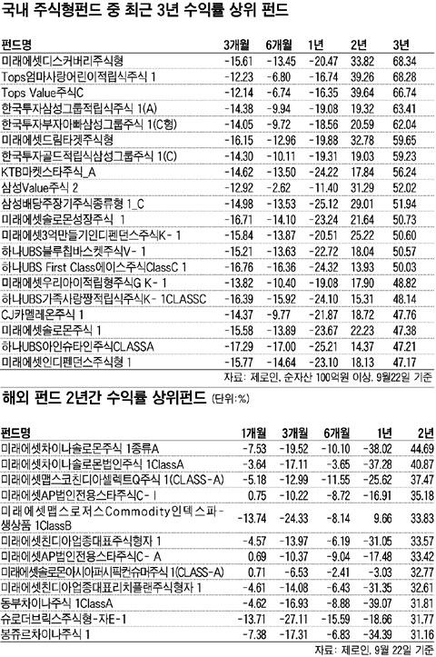 Á¦·ÎÀο¡ µû¸£¸é ÃÖ±Ù 2³â°£ ±¹³»¿¡ ¼³Á¤µÈ Àüü ÇØ¿Ü ÁÖ½ÄÇüÆÝµåÀÇ Æò±Õ ¼öÀÍ·üÀº 2.32%. °°Àº ±â°£ Áß±¹ ÁÖ½ÄÇüÆÝµåÀÇ Æò±Õ ¼öÀÍ·üÀº 26.8%·Î ³ªÅ¸³µ´Ù. ÇÑÈÁõ±Ç Á¶¿ëÂù Áß±¹ºÐ¼®ÆÀÀåÀº "ÃÖ±Ù 18°³¿ù »çÀÌ¿¡ Áß±¹ Áõ½Ã°¡ ±Þµî¶ôÇÏ¸é¼ Áß±¹ ÆÝµåµéÀÌ ¾öû³ ¼Õ½ÇÀ» º¸°í ÀÖÁö¸¸ ºÒ°ú 2³â Àü¸¸ ÇØµµ Áß±¹ Áõ½Ã´Â ÇöÀ纸´Ù ³·Àº ¼öÁØÀ̾ú´Ù"¸ç "»ó´ç¼ö Áß±¹ ÆÝµå°¡ ÀÛ³â 5¿ù, »óÇÏÀÌ Áõ½Ã°¡ 5000¼± ºÎ±Ù¿¡¼ ¼³Á¤µÅ Áö±Ý°ú °°ÀÌ Å« ¼Õ½ÇÀ» ÀÔ°Ô µÈ °Í"À̶ó°í ¸»Çß´Ù.