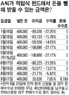 ȯ¸Å¼ö¼ö·á´Â ¸¶Áö¸·À¸·Î µ·À» ³³ÀÔÇÑ ½ÃÁ¡À» ±âÁØÀ¸·Î ºÎ°úµÈ´Ù. Áï, ¸Å´Þ ÀÏÁ¤¾×À» ³³ÀÔÇØ¿Â Àû¸³½Ä ÅõÀÚÀÚ¶ó¸é ȯ¸Å ½ÃÁ¡¿¡¼ ¼® ´Þ À̳»¿¡ Àû¸³ÇÑ ±Ý¾×¿¡ ´ëÇØ¼´Â ȯ¸Å¼ö¼ö·á¸¦ ³»¾ß ÇÑ´Ù. ¹°·Ð ¸¶Áö¸· ¼® ´Þ µ¿¾È Áõ½Ã°¡ Ç϶ô¼¼¸¦ º¸¿© ÀÌ ±â°£ ³³ÀÔÇÑ ±Ý¾×ÀÌ ¸¶À̳ʽº ¼öÀÍ·üÀ» ³Â´Ù¸é ȯ¸Å¼ö¼ö·á¸¦ ³»Áö ¾Ê¾Æµµ µÈ´Ù. ȯ¸Å¼ö¼ö·á´Â ȯ¸Å±Ý¾×ÀÌ ¾Æ´Ñ ÀÌÀͱݿ¡ ´ëÇØ ºÎ°úµÇ±â ¶§¹®ÀÌ´Ù. ÇÏÁö¸¸ A¾¾ÀÇ °æ¿ìó·³ ¸¶Áö¸· ¼® ´Þ µ¿¾È ³³ÀÔÇÑ ±Ý¾×¿¡¼ ¼öÀÍÀÌ »ý°Ü Àüü ÅõÀڱݾ×ÀÌ ¿ø±ÝÀ» °¡±î½º·Î »óȸÇß´Ù¸é ȯ¸Å¼ö¼ö·á¸¦ Á¦ÇÏ°í ³ ±Ý¾×Àº ¿ø±Ýº¸´Ù ¸ðÀÚ¶ö ¼ö ÀÖ´Ù.