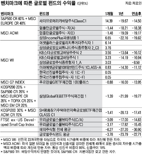 ÇÏÁö¸¸ ÀÌµé º¥Ä¡¸¶Å©°¡ Àý´ëÀûÀÌÁø ¾Ê´Ù. ½ÇÁ¦·Î´Â ¸¹Àº ±Û·Î¹ú ÁÖ½ÄÆÝµåµéÀÌ ¿©·¯ °³ Áö¼ö¸¦ ¼¯¾î »ç¿ëÇÑ´Ù. ¼¼ÀÌÀ¯·Î¸Þ¸®Ä«¹è´çÁÖ½ÄÆÝµå´Â S&P500 CR(¹è´ç¼öÀÍÀº »« ½ÇÀûÀ¸·Î ¹èºÎÇÑ Áö¼ö)À» 60%, MSCI À¯·´ CRÀ» 40%·Î ¼¯¾î¼ »ç¿ëÇÑ´Ù.
