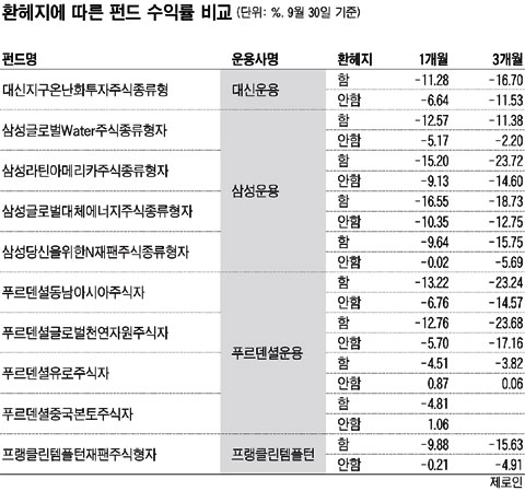 ÆÝµåÆò°¡»ç Á¦·ÎÀο¡ µû¸£¸é ȯÇìÁö¸¦ ÇÏÁö ¾ÊÀº ȯ³ëÃâÇü ÆÝµå ¼öÀÍ·üÀÌ »ó´ëÀûÀ¸·Î ¼±¹æÇϰí ÀÖ´Â °ÍÀ¸·Î ³ªÅ¸³µ´Ù. ȯÇìÁö¸¦ Çϸé Á¤ÇØÁø °¡°Ý¿¡ ȯ°Å·¡¸¦ ÇØ¾ß ÇÏÁö¸¸ ȯÇìÁö¸¦ ÇÏÁö ¾ÊÀº °æ¿ì¿£ ÃÖ±Ù ¿À¸¥ ȯÀ²ÀÌ ±×´ë·Î Àû¿ëµÅ ¿øÈȯ»ê ¼öÀÍ·üµµ ±×¸¸Å ³ô¾ÆÁö±â ¶§¹®ÀÌ´Ù. °°Àº Áö¿ª¿¡ ÅõÀÚÇÏ´Â ÇØ¿ÜÆÝµå¶ó°í ÇÒÁö¶óµµ ȯÇìÁö ¿©ºÎ¿¡ µû¶ó ¼öÀÍ·ü(1°³¿ù) Â÷À̰¡ 5~10%Æ÷ÀÎÆ®¿¡ À̸£°í ÀÖ´Ù. ´ë½ÅÅõ½Å¿î¿ëÀÇ 'Áö±¸¿Â³ÈÅõÀÚÁÖ½ÄÁ¾·ùÇü'ÀÇ °æ¿ì ȯÇìÁöÇü »óǰÀÇ ÃÖ±Ù 1°³¿ù ¼öÀÍ·üÀº ¸¶À̳ʽº11.28%¿´Áö¸¸, ȯ³ëÃâÇüÀº ¸¶À̳ʽº6.64%·Î ȯÇìÁö¸¦ ÇÏÁö ¾Ê¾ÒÀ» ¶§ ¼º°ú°¡ »ó´ëÀûÀ¸·Î ÁÁ¾Ò´Ù. »ï¼ºÅõ½Å¿î¿ëÀÇ '±Û·Î¹úWaterÁÖ½ÄÁ¾·ùÇü' ¿ª½Ã ȯÇìÁöÇü(-12.57%)º¸´Ù ȯ³ëÃâÇü(-5.17%)ÀÇ 1°³¿ù ¼öÀÍ·üÀÌ µÎ ¹è ÀÌ»ó ¿ì¼öÇß´Ù. ±¹³»¿¡¼ ¼³Á¤µÈ ´ëºÎºÐ ÇØ¿ÜÆÝµå´Â ȯÇìÁö¸¦ Çϰí ÀÖ¾î Ãֱ٠ȯÀ² »ó½ÂÀÇ ¼öÇý¿¡¼ ºñÄѼ ÀÖ´Ù. ÀÛ³âºÎÅÍ È¯ÇìÁö¸¦ ÇÏÁö ¾Ê´Â »óǰµéÀÌ ¼¼È÷ µîÀåÇϰí ÀÖ´Ù.
