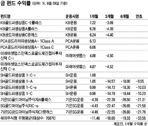 KB¿î¿ëÀÇ '°ñµåÆÄ»ý»óǰ'°ú PCA¿î¿ëÀÇ '°ñµå¸®Ä¡ÆÄ»ý»óǰ' µî ±Ý °ü·Ã ¼±¹°Áö¼ö¿¡ ÅõÀÚÇÏ´Â »óǰÀº ±Ý°ªÀÇ µ¿ÇâÀ» °¡Àå Ãæ½ÇÈ÷ ¹Ý¿µÇØ ÇöÀç·Î¼± ¼öÀÍ·üµµ ÁÁÀº ÆíÀÌ´Ù. ±×·¯³ª ±âÀºSG¿î¿ëÀÇ '°ñµå¸¶ÀÌ´×ÁÖ½Ä' µî °ü·Ã ÁֽĿ¡ ÅõÀÚÇÏ´Â ÆÝµåÀÇ °æ¿ì´Â ÃÖ±Ù ±Û·Î¹ú Áõ½Ã ħü¸¦ ¹Ý¿µÇØ ¼öÀÍ·üµµ ¸¶À̳ʽº¸¦ ±â·ÏÇϰí ÀÖ´Ù.