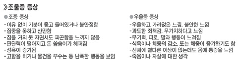 ºÐ´ç¼¿ï´ëº´¿ø Á¤½Å°ú ÇÏÅÂÇö ±³¼ö´Â "Á¶¿ïÁõÀº ¿ì¿ïÁõº¸´Ù Àç¹ßÀÌ Àæ°í º´À» ¾Î´Â ±â°£µµ ±æ¾î ÀÚ»ì À§Çè¿¡ ³ëÃâµÉ °¡´É¼ºµµ ³ô´Ù"°í ¸»Çß´Ù. ƯÈ÷ ±âºÐÀÇ º¯È°¡ ½ÉÇØ Á÷ÀåÀ̳ª °¡Á·µé°ú °¥µîÀ» ºúÀ» °¡´É¼ºµµ Å©´Ù. Á¶¿ïÁõÀÌ ÀÖÀ¸¸é ±âºÐÀº ¿ì¿ïÇÏÁö¸¸ ¿¡³ÊÁö´Â Ãæ¸¸Çϰųª, ¸Å¿ì ÃÊÁ¶ÇØÇÏ´Â µî Áõ»óÀÌ ¹«Ã´ ´Ù¾çÇÏ°Ô ³ªÅ¸³ª Ãæµ¿ÀûÀ¸·Î ÇൿÇÒ À§Çèµµ ³ô´Ù.