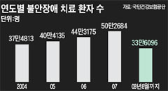 ÃÖ±Ù ±¹È¸ º¸°Çº¹Áö°¡Á·À§¿øÈ¸ Àӵμº ÀÇ¿øÀÌ °Ç°º¸Çè°ø´ÜÀÇ 'ºÒ¾È Àå¾Ö Áø·áÀοø ÇöȲ'À» ºÐ¼®ÇØ ¹ßÇ¥ÇÑ ÀÚ·á¿¡ µû¸£¸é, 2004³â 37¸¸ ¸í¿¡ ºÒ°úÇÏ´ø ºÒ¾ÈÀå¾Ö Áø·á ȯÀÚ ¼ö´Â 2007³â¿¡ 50¸¸ ¸íÀ» ³Ñ¾ú°í, ¿Ã ÇØ¿¡´Â 8¿ù±îÁö¸¸ 33¸¸ ¸íÀ¸·Î Áý°èµÆ´Ù. ¿ÃÇØ Àüü ºÒ¾ÈÀå¾Ö ȯÀÚ¼ö¸¦ »ó¹Ý±â ¼öÄ¡ÀÇ 2¹è·Î¸¸ ÃßÁ¤Çصµ 66¸¸ ¸í¿¡ À̸¦ Àü¸ÁÀÌ´Ù. ¿Ã ÃʺÎÅÍ 8¿ù±îÁö ºÒ¾ÈÀå¾Ö·Î Ä¡·á¸¦ ¹ÞÀº »ç¶÷µé Áß¿¡¼ 60´ë°¡ 9¸¸9721¸íÀ¸·Î °¡Àå ¸¹¾Ò°í, 40´ë°¡ 7¸¸916¸íÀ¸·Î ±× ´ÙÀ½À̾ú´Ù.