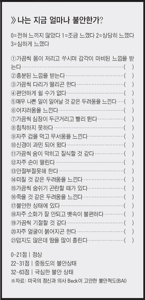 ºÒ¾ÈÀå¾Ö´Â ´Ù½Ã ¡ãÀÌÀ¯ ¾øÀÌ ºÒ¾ÈÇÑ »ý°¢¿¡ »ç·ÎÀâÈ÷´Â ¹üºÒ¾ÈÀå¾Ö ¡ã°©ÀÛ½º·¯¿î ºÒ¾È°¨ ¶§¹®¿¡ ¼ûÀ» ½¬±â Èûµé°í 10ºÐ³»¿¡ Á×À» °Í °°Àº ´À³¦ÀÌ µå´Â °øÈ²Àå¾Ö ¡ã¼ÕÀÌ ÁöÀúºÐÇÒ±îºÁ ºÒ¾ÈÇØ °è¼Ó ¼ÕÀ» ¾Ä´Â °¹ÚÀå¾Ö ¡ã¼ºÆø·ÂÀ» ´çÇÑ ÈÄ ³²¼º¸¸ ºÁµµ ºÒ¾ÈÇÑ °¨Á¤À» ´À³¢´Â µîÀÇ ¿Ü»ó ÈÄ ½ºÆ®·¹½º Àå¾Ö ¡ã»ç¶÷µé ¾Õ¿¡ ¼¸é ºÒ¾ÈÇØÁö´Â »çȸ°øÆ÷Áõ µîÀ¸·Î ³ª´¶´Ù.