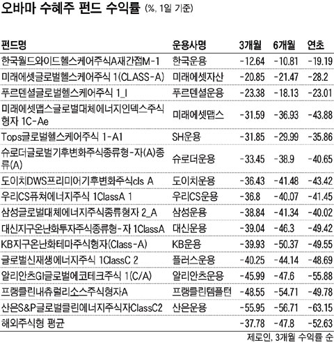 ¹Ì±¹ ´ëÅë·ÉÀ¸·Î ´ç¼±µÇ¸é¼ ÆÝµå¿¡µµ ±× ¿µÇâÀÌ ¹ÌÄ¡°í ÀÖ´Ù. ¿À¹Ù¸¶ °ü·Ã ¼öÇýÁÖ¿¡ ÅõÀÚÇÏ´Â Àϸí '¿À¹Ù¸¶ ÆÝµå'µé ¼ºÀûÀÌ ´ëü·Î ±¦Âú°Ô ³ª¿À°í ÀÖ´Â °ÍÀÌ´Ù. ¿À¹Ù¸¶ ÆÝµå·Î´Â ´ëü¿¡³ÊÁö¡¤ÇコÄɾî(health care) ÆÝµå¸¦ ´ëÇ¥ÀûÀ¸·Î ²ÅÀ» ¼ö ÀÖ´Ù.