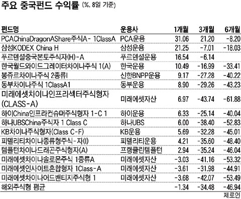 »ï¼º¿î¿ëÀÇ '»ï¼ºKODEX China H'(21.25%)°¡ ´ëÇ¥ÀûÀÌ´Ù. PCAÂ÷À̳ªµå·¡°ïAShareÁÖ½ÄA-1ClassA´Â 3°³¿ù ¼öÀÍ·üµµ 21.2%·Î °í°øÇàÁøÀ» Çß´Ù.