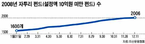 ÀÚ»ê¿î¿ëÇùȸ¿¡ µû¸£¸é Áö³ 11ÀÏ ÇöÀç Àüü ÆÝµå 9798°³ Áß ¼³Á¤¾×ÀÌ 10¾ï¿ø ¹Ì¸¸ÀÎ ÆÝµå´Â 20.5%ÀÎ 2006°³·Î ³ªÅ¸³µ´Ù. ÆÝµå 5°³ Áß 1°³°¡ ÀÚÅõ¸® ÆÝµå¶ó´Â ¸»ÀÌ´Ù. ÀÚÅõ¸® ÆÝµå´Â 2005³â ¸» Àüü ÆÝµåÀÇ 22%¿¡ À̸£·¶´Ù°¡ ÆÝµå·Î ÀÚ±ÝÀÌ À¯ÀÔµÇ¸é¼ ÀçÀ۳⠸»¡¤ÀÛ³â 17%´ë·Î Ãà¼ÒµÆ´Ù. ÇÏÁö¸¸ ¿Ã ¿©¸§ºÎÅÍ ´Ù½Ã ´Ã¾î Áö³´Þ 20%´ë¸¦ ³Ñ¾î¼¹´Ù. Àüü ÆÝµå ¼ö´Â Áö³ 8¿ù ¸»(1¸¸370°³)º¸´Ù 600¿© °³ ÁÙ¾úÁö¸¸, °°Àº ±â°£ ÀÚÅõ¸® ÆÝµå´Â ¿ÀÈ÷·Á 1862°³¿¡¼ 150¿© °³ Áõ°¡ÇÑ °ÍÀÌ´Ù. ºÎµ¿»ê¡¤¿øÀÚÀç ÆÝµå¸¦ Á¦¿ÜÇϰí Áõ±ÇÇüÆÝµå(ÁÖ½ÄÇü¡¤È¥ÇÕÇü¡¤Ã¤±ÇÇü)¸¸ µû·Î ¶¼ ³õ°í º¸¸é ÀÚÅõ¸® ÆÝµå ºñÀ²Àº 4°³ Áß 1°³²Ã·Î ´õ ³ô¾ÆÁø´Ù.