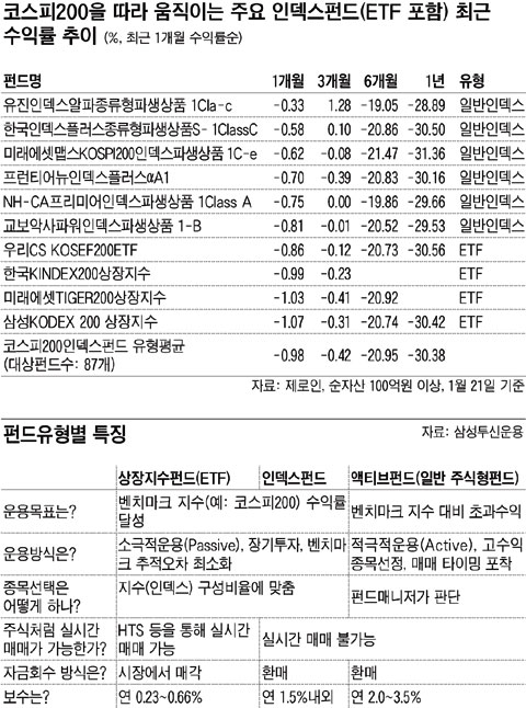 ÆÝµåÆò°¡»ç Á¦·ÎÀο¡ µû¸£¸é À¯°¡Áõ±Ç½ÃÀåÀÇ ´ëÇ¥Á¾¸ñÀ» ¸ð¾Æ³õÀº ÄÚ½ºÇÇ200Áö¼ö¸¦ ÃßÀûÇÏ´Â, ¼øÀÚ»ê 100¾ï¿ø ÀÌ»ó À妽ºÆÝµåÀÇ ÃÖ±Ù 1³â Æò±Õ ¼öÀÍ·üÀº -30.38%·Î ³ªÅ¸³µ´Ù. ¸¶Âù°¡Áö·Î ÄÚ½ºÇÇ200Áö¼ö¸¦ ±âÁØÀ¸·Î »ï´Â ¼øÀÚ»ê 100¾ï¿ø ÀÌ»ó ETFÀÇ °°Àº ±â°£ ¼öÀÍ·üÀ» »ìÆìºÃ´Ù. ÀÌ¿¡ ÇØ´çµÇ´Â ETF´Â ¿ì¸®CSÀÚ»ê¿î¿ëÀÇ '¿ì¸®CS KOSEF200'°ú »ï¼ºÅõ½Å¿î¿ëÀÇ '»ï¼ºKODEX200'À¸·Î, ÃÖ±Ù 1³â ¼öÀÍ·üÀÌ °¢°¢ -30.56%, -30.42%·Î Áý°èµÆ´Ù. ETF ¼öÀÍ·üÀÌ °°Àº À¯ÇüÀÇ À妽ºÆÝµå Æò±Õ¿¡ ¾à°£ ¸ø ¹ÌÄ¡´Â °ÍÀ¸·Î ³ªÅ¸³µ´Ù. ÄÚ½ºÇÇ200 À妽ºÆÝµå Áß °¡Àå ¼öÀÍ·üÀÌ ÁÁ¾Ò´ø À¯ÁøÀÚ»ê¿î¿ëÀÇ 'À¯ÁøÀ妽º¾ËÆÄÁ¾·ùÇüÆÄ»ý»óǰ1ClassC'ÀÇ ÃÖ±Ù 1³â ¼öÀÍ·ü -28.89%¿Í ºñ±³ÇÏ¸é °ÝÂ÷´Â 1.5%Æ÷ÀÎÆ® ¼öÁØÀ¸·Î ¹ú¾îÁø´Ù.